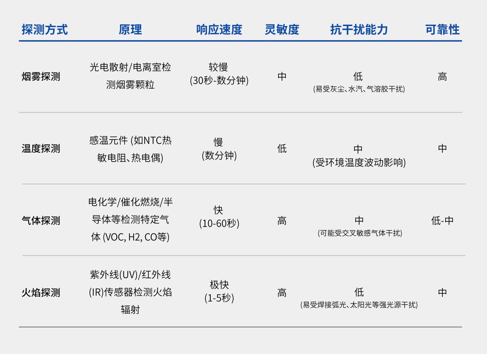 深入理解锂离子电池热失控的三阶段演化特征(产气、温升、起火/爆炸),是发展有效早期预警系统的关键。不同探测技术依据其原理,在响应速度、灵敏度、抗干扰性、适用场景及可靠性方面存在显著差异。下表对几种核心技术在电池热失控监测中的应用特性进行了系统对比: