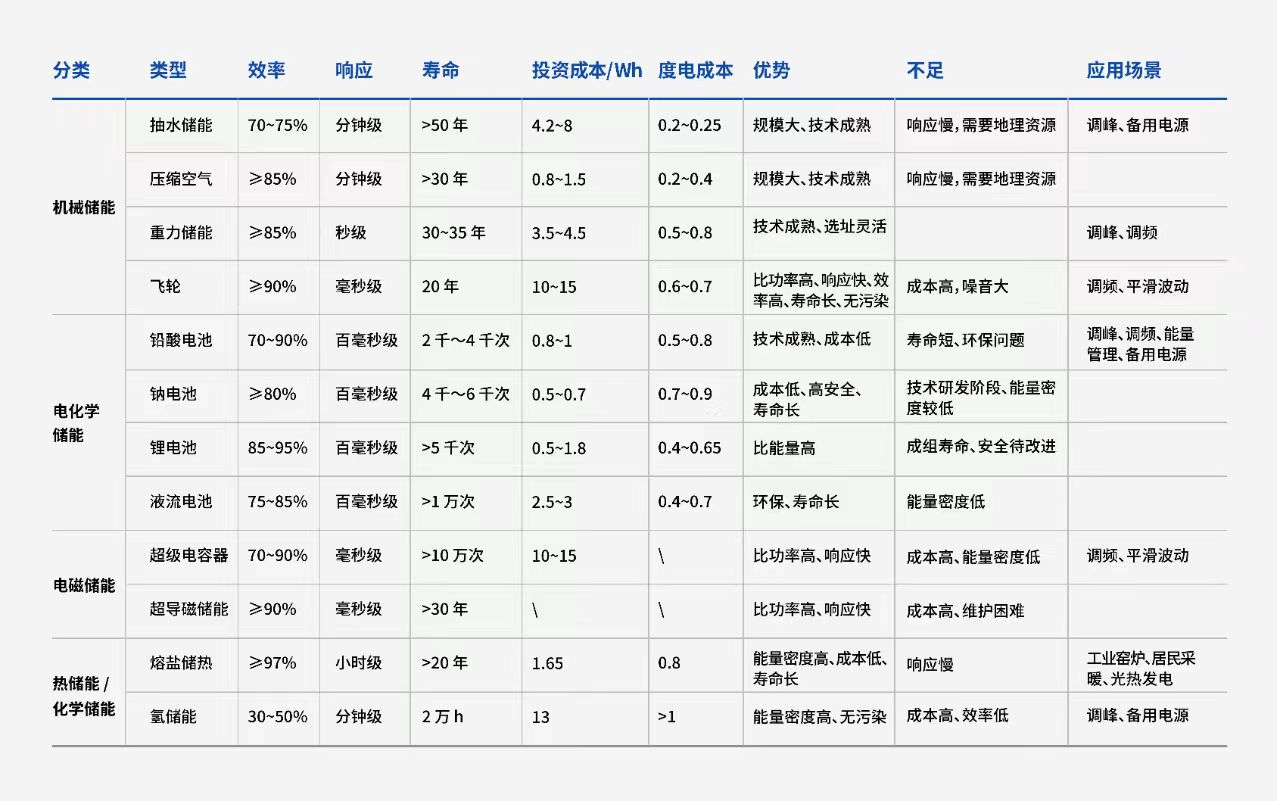 综上可见,储能技术路线百花齐放,各有千秋。机械储能以抽水蓄能为核心,在大容量长时调节领域具有成本优势,但受地理条件限制较大;电磁储能凭借毫秒级响应速度占据高频调节场景,却因能量密度低和成本问题难以大规模应用;热储能与化学储能则更聚焦于特定场景的能源形态转换,全链条效率仍有提升空间。