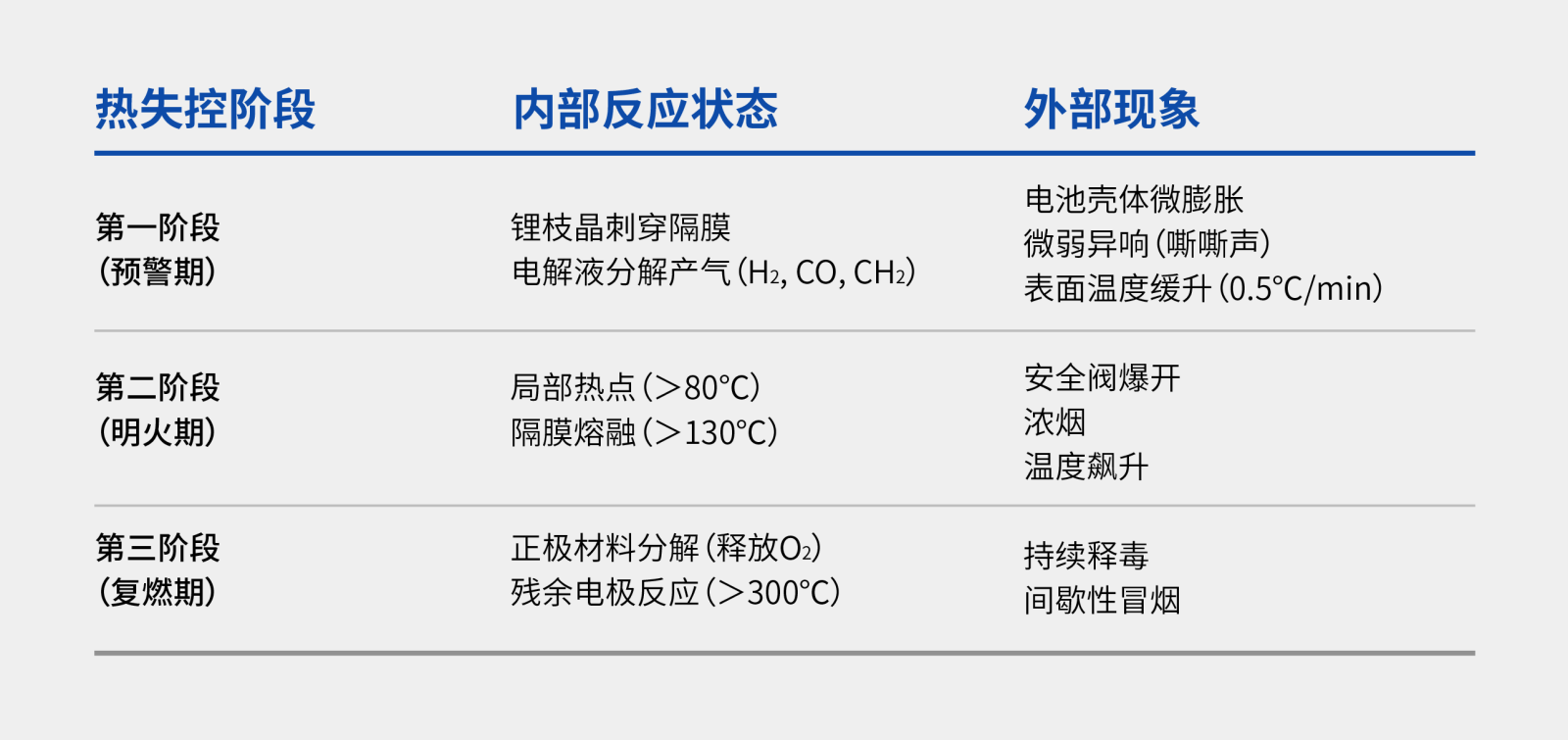 理解热失控是构建有效防护的前提。当锂离子电池发生热失控时,会经历一系列复杂反应,通常可分为三个关键阶段,每个阶段具有不同的内部反应状态和外部可观测现象: