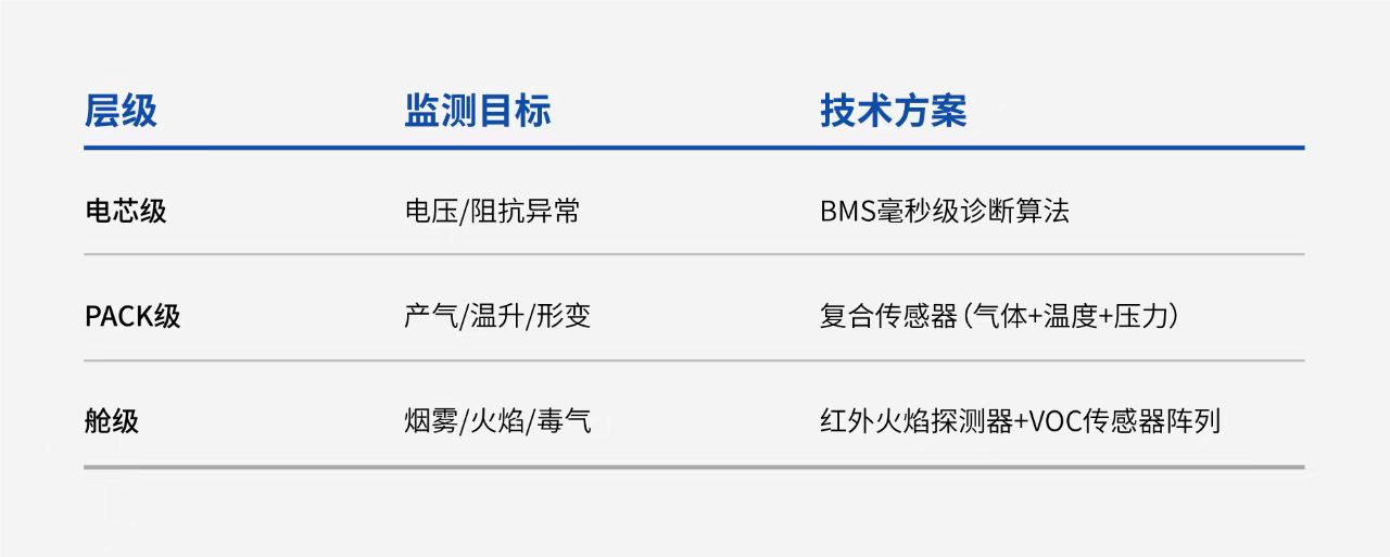 针对不同阶段主导的异常物理量变化(如特征气体释放、温度骤升、烟雾生成、火焰出现、内部压力与形变等),多种高灵敏度探测技术应运而生。在此基础上技术的融合应用,为热失控的早期识别、精准预警及及时干预赢得了至关重要的时间窗口。
