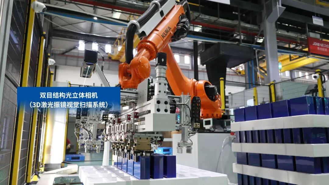 模组产线的核心挑战之一在于电芯上料的精度、效率与兼容性。产线升级后,奇点能源为负责电芯上料的机械臂配备了一副“智慧眼镜”——双目结构光立体相机(3D激光振镜视觉扫描系统)。