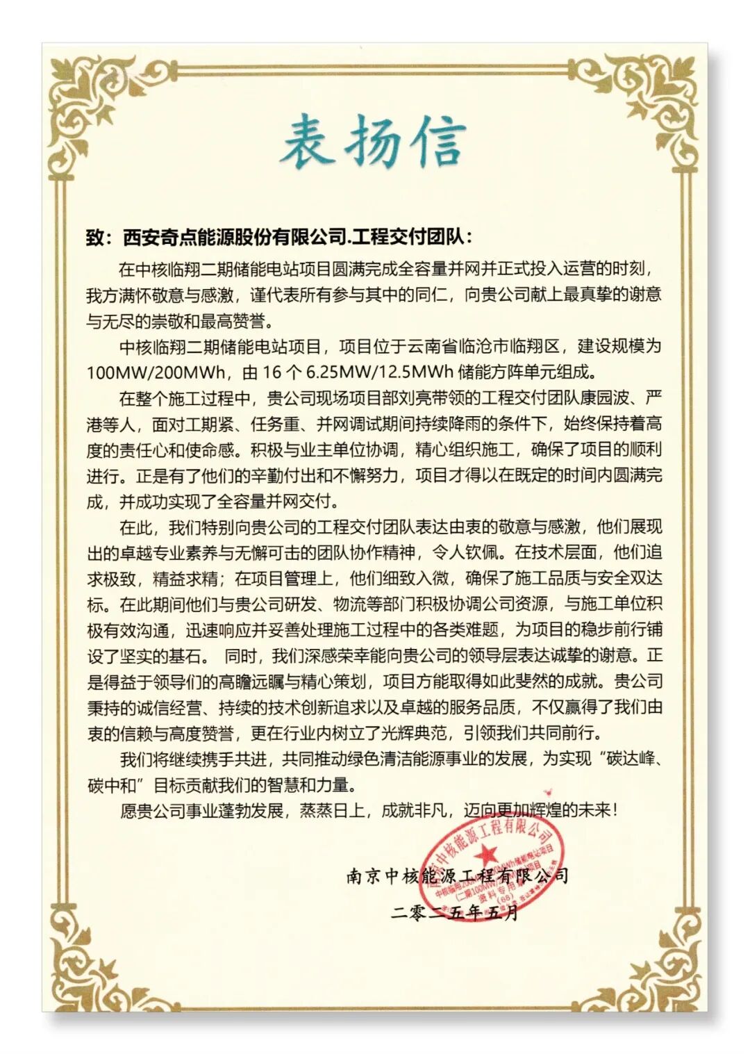 项目并网后,客户特别致以感谢信,字字句句皆是肯定:”面对工期紧、任务重、并网调试期间持续降雨的条件下,始终保持着高度的责任心和使命感。积极与业主单位协调,精心组织施工,确保了项目的顺利进行。”这封表扬信,既是荣誉勋章,更是鞭策奇点能源不断前行的动力。