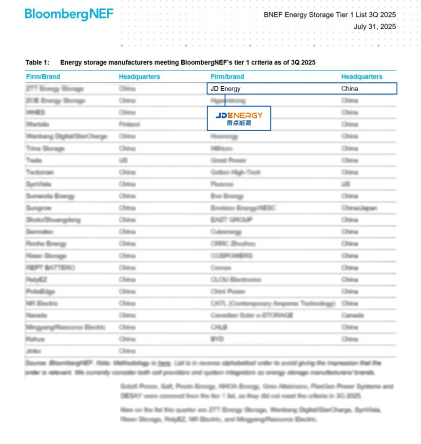 近日,全球新能源领域权威研究机构彭博新能源财经(BloombergNEF,以下简称“BNEF”)重磅发布2025年第三季度全球一级储能厂商(Tier 1)榜单。凭借卓越的技术实力、稳健的交付能力和出色的市场表现,奇点能源再度强势上榜,蝉联全球一级储能厂商(Tier 1),有力印证了其在全球储能市场的领先地位。